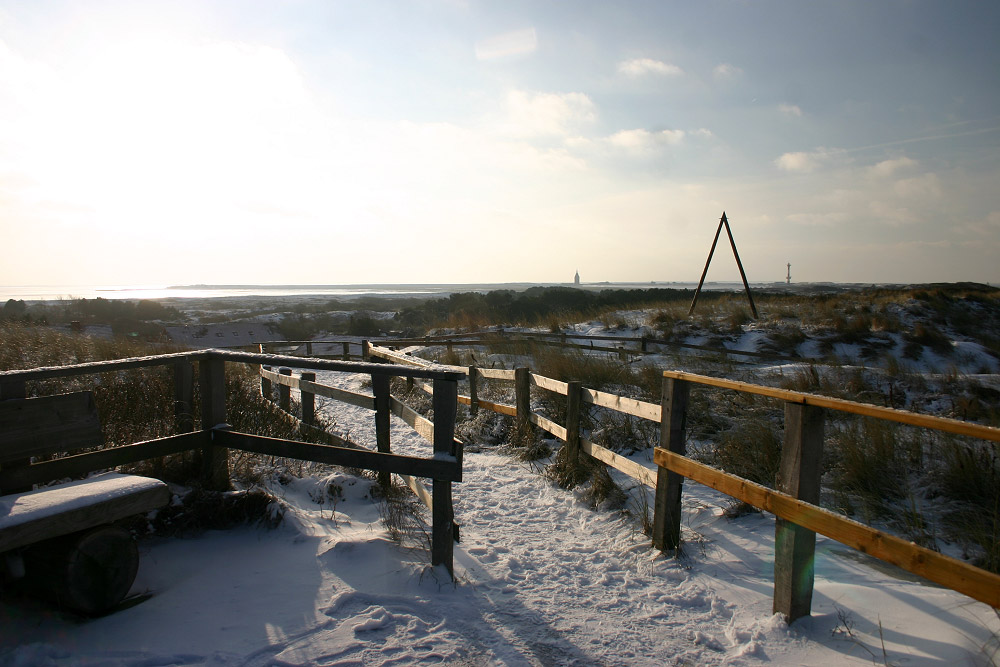Ein Dünenüberweg befindet sich wenige Meter entfernt von hier. Links ginge es hinunter zum »Bielefelder Heim« und rechts zum Strand.