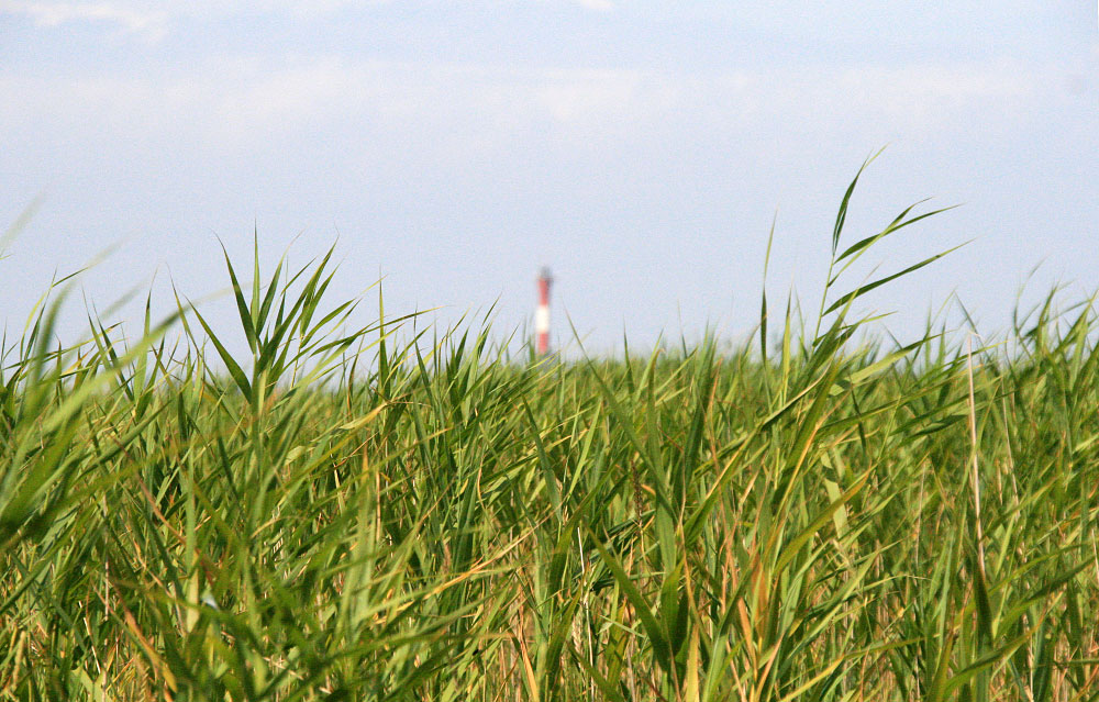 Das Schilf ist hier aber ganz schön hoch gewachsen. Dennoch erkennt man, ganz entfernt und tiefenunscharf, den Neuen Leuchtturm.