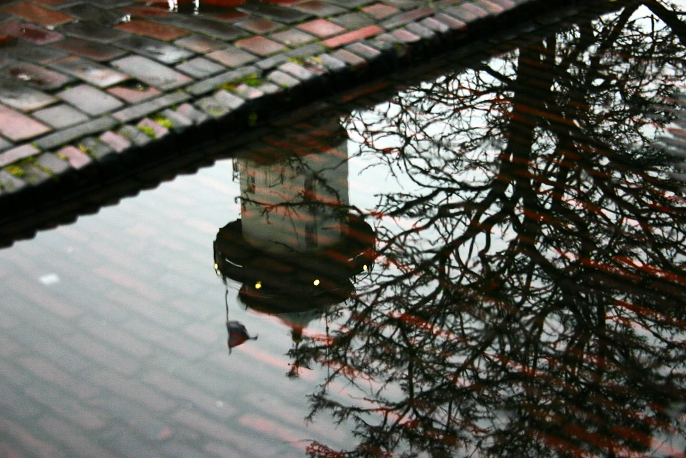 Der Alte Leuchtturm spiegelt sich in einer Pfütze in der »Bahnhofstraße«.