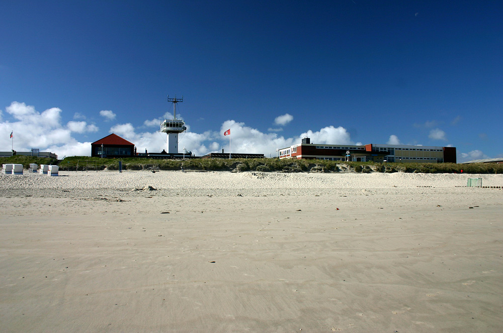 Blick bei Niedrigwasser auf die Signalstation, das Kurmittelhaus und den vorgelagerten, noch Strandkorb-losen Tagesstrand.