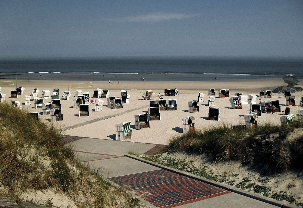 Das Strandkorb-Westfeld mit dem sogenannten »Schulze-Steg«. Links sind die beiden Volleyballfelder zu erkennen, an denen sich jedes Jahr aufs Neue sportbegeisterte Urlauber zum Beachvolleyballspielen treffen.