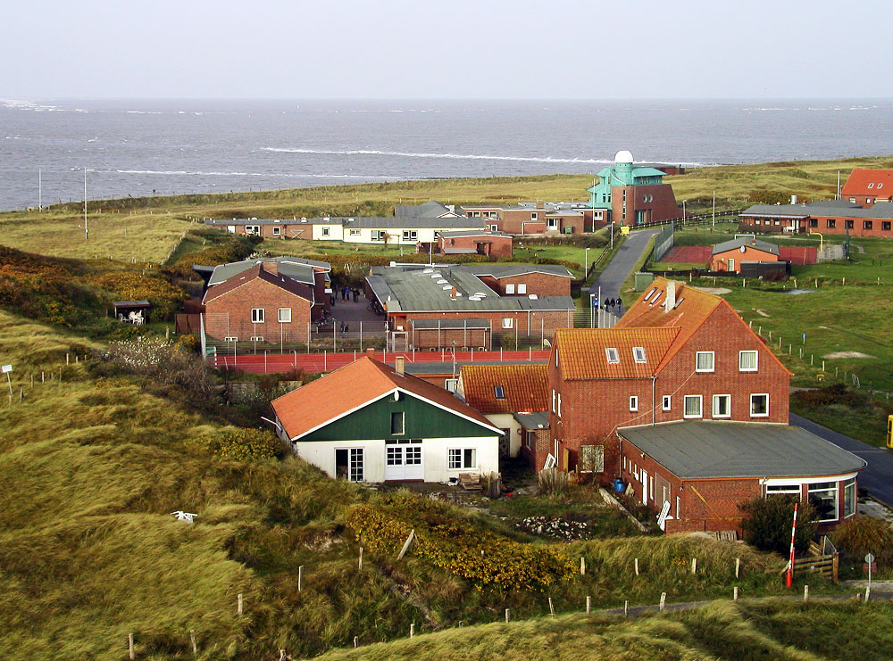 Hier sehen wir das Westdorf mit »Straße zum Westen«, dem »Westturm-Café« und einigen Jugendheimen. Im Hintergrund ist die »Harle«, das Fahrwasser zwischen Wangerooge und Spiekeroog, zu sehen.