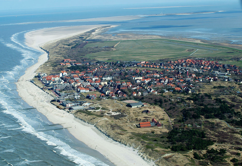 Fast das gesamte Inseldorf ist auf diesem Bild zu sehen – bis auf die südwestlichen Ausläufer. Dazu im Vordergrund die Heidedünen und im Hintergrund der Ostinnengroden, das Osteert, Minsener Oog und sogar die Vogelinsel Mellum.