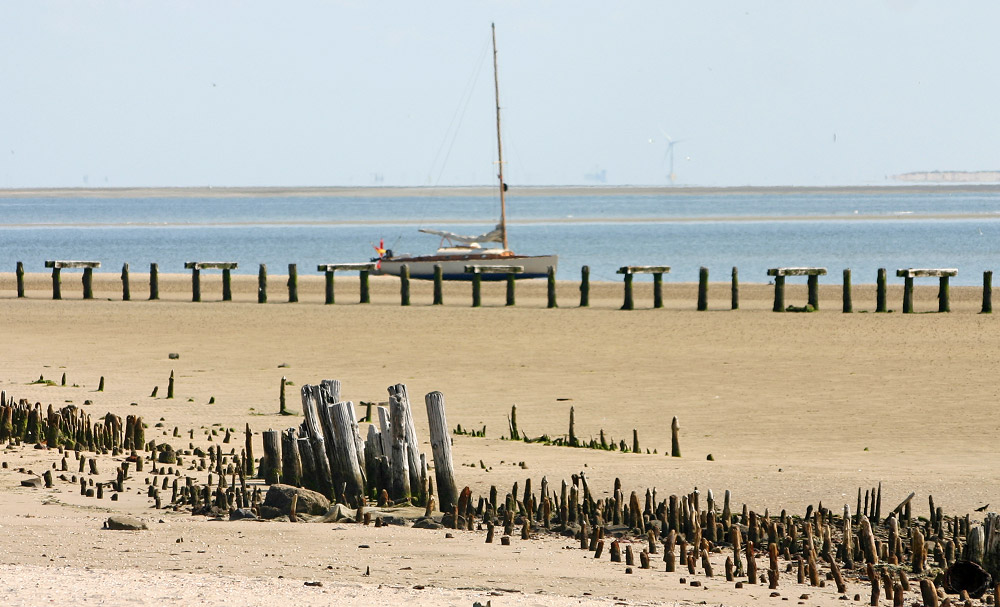 Gestrandet ist das Segelboot hier am Ostende natürlich nicht, es ist nur trocken gefallen und wird pünktlich zum Hochwasser wieder die berühmte »Hand breit Wasser unterm Kiel« haben.