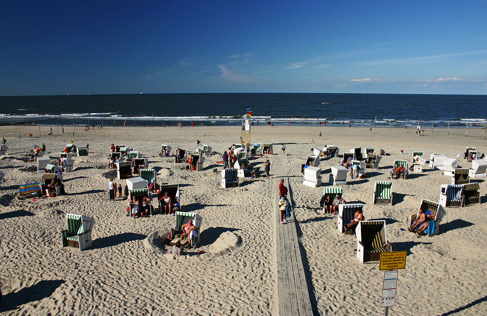 Richtig schönes Wetter herrschte am ersten Septemberwochenende 2010, an dem das Foto entstand. Die meisten Strandkörbe sind vermietet, vor allem die im Bereich des Hauptbadefelds sind sehr beliebt.