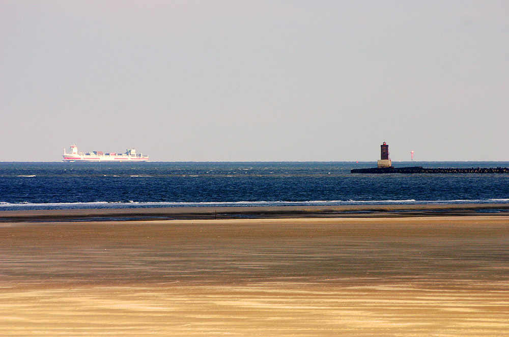 Ein weiteres Bild, das von den Ostdünen aus aufgenommen wurde, diesmal allerdings in Richtung Ostnordost. Zu sehen sind der breite Oststrand im Vordergrund und dahinter das Weser-Fahrwasser und die Leuchtfeuer »Minsener Oog Buhne A« (Feuer mittlerweile gelöscht) und »Tegeler Plate« (roter Turm im Hintergrund; in Betrieb seit 1965).