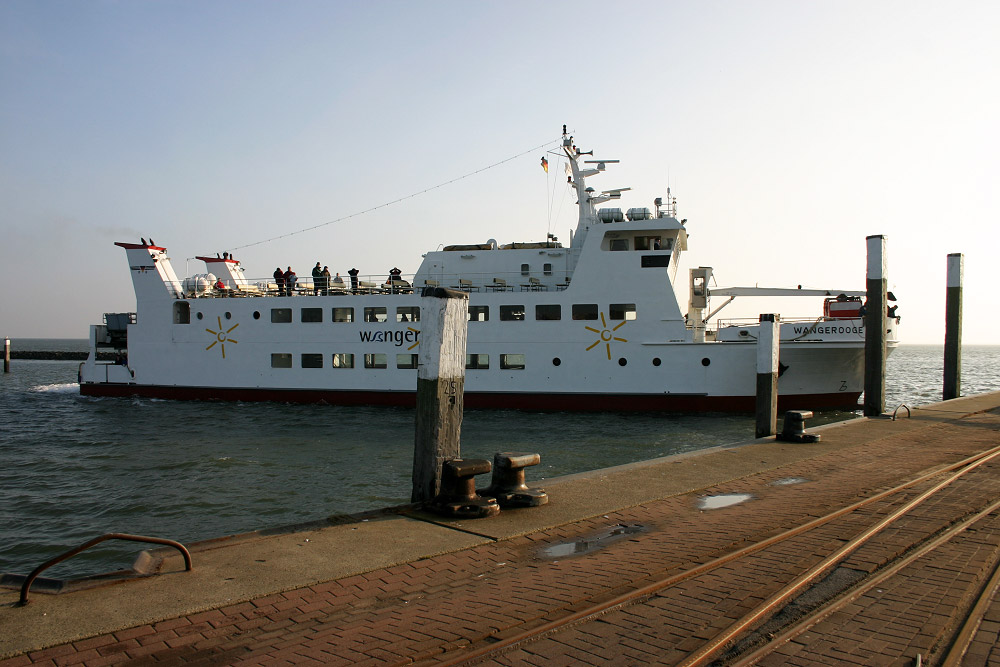 Gleich wird die MS ›Wangerooge‹ am Anleger festmachen, sie ist bereits beim Wendemanöver. Richtig viele Gäste sind nicht auf dem Schiff, das ist im November aber auch nicht zu erwarten.