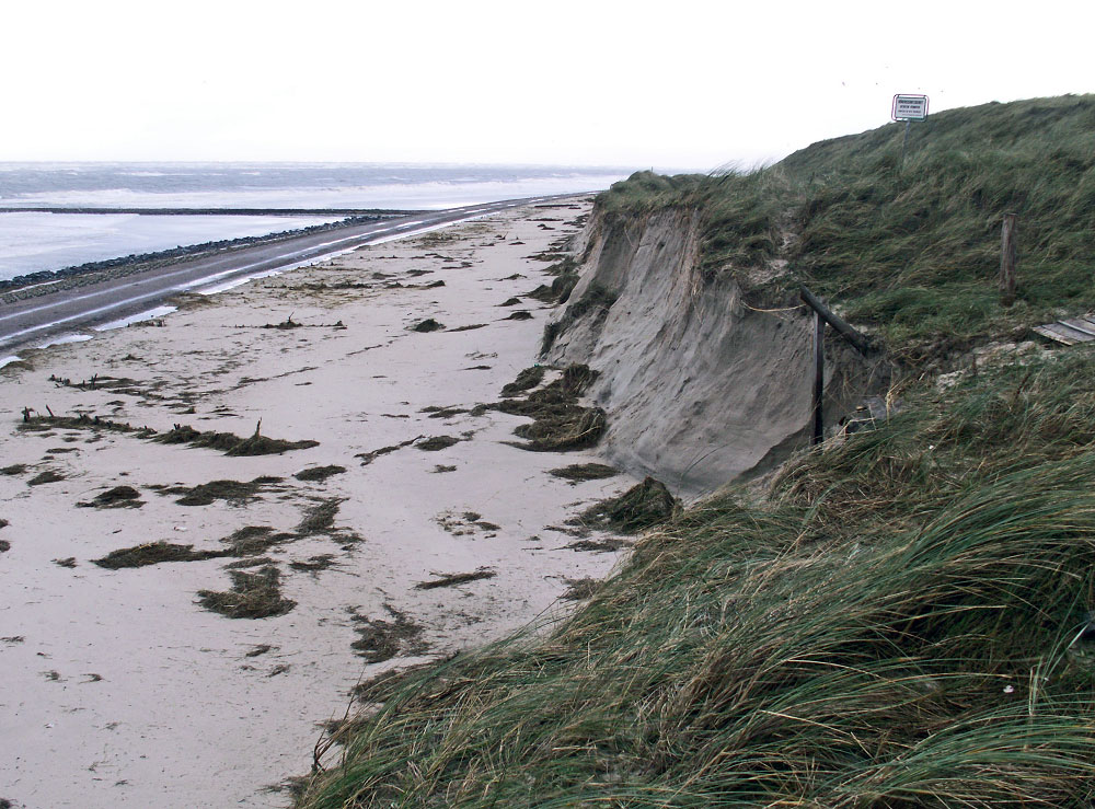 Die letzte Sturmflut hat selbst oberhalb des Längswerkes an einem Teil der Dünen genagt. Hier an der Überwegung hat sich eine richtige Abbruchkante gebildet.