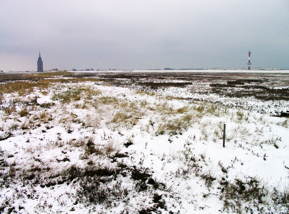 Die überzuckerte Lagune im Westaußengroden. Im Hintergrund sehen Sie den Westturm und den Neuen Leuchtturm, zwei vom Charakter her völlig unterschiedliche Türme.