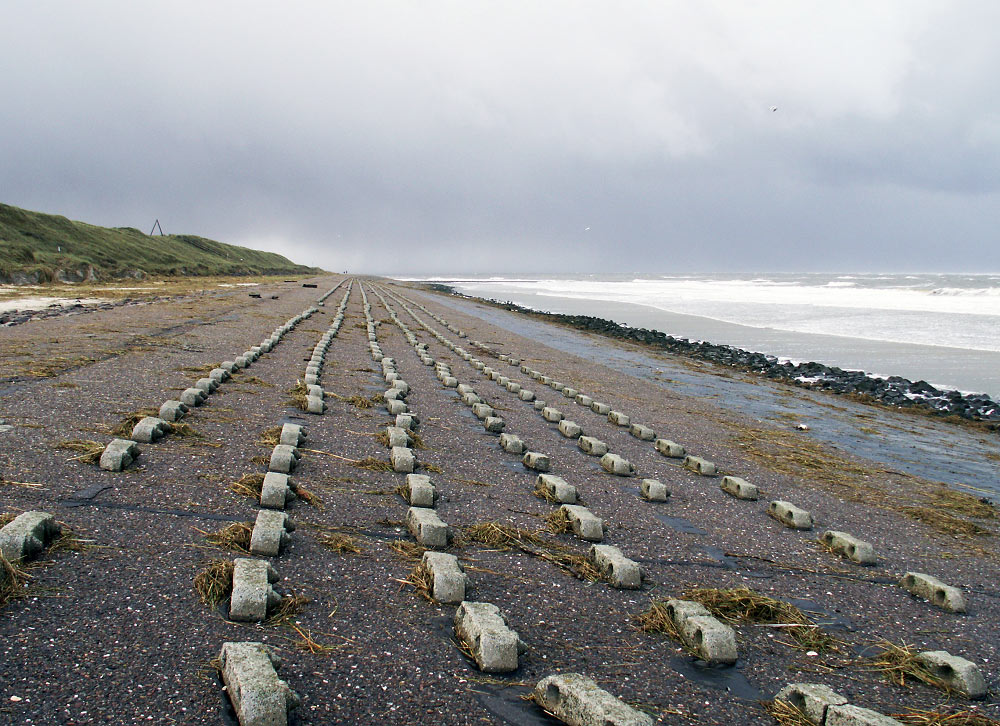 Jede Menge Unrat liegt auf dem Längswerk herum. Dieses etwas flachere Deckwerk wurde mit Leichtigkeit von den anrollenden Brechern überflutet; bis an die Dünenkante sind die Wellen gelangt.