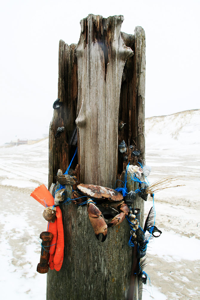 ‹ Sieh an, ein Taschenkrebs! Und jede Menge weiteres Strandgut. Da war ein(e) richtige(r) Künstler(in) am Werk.