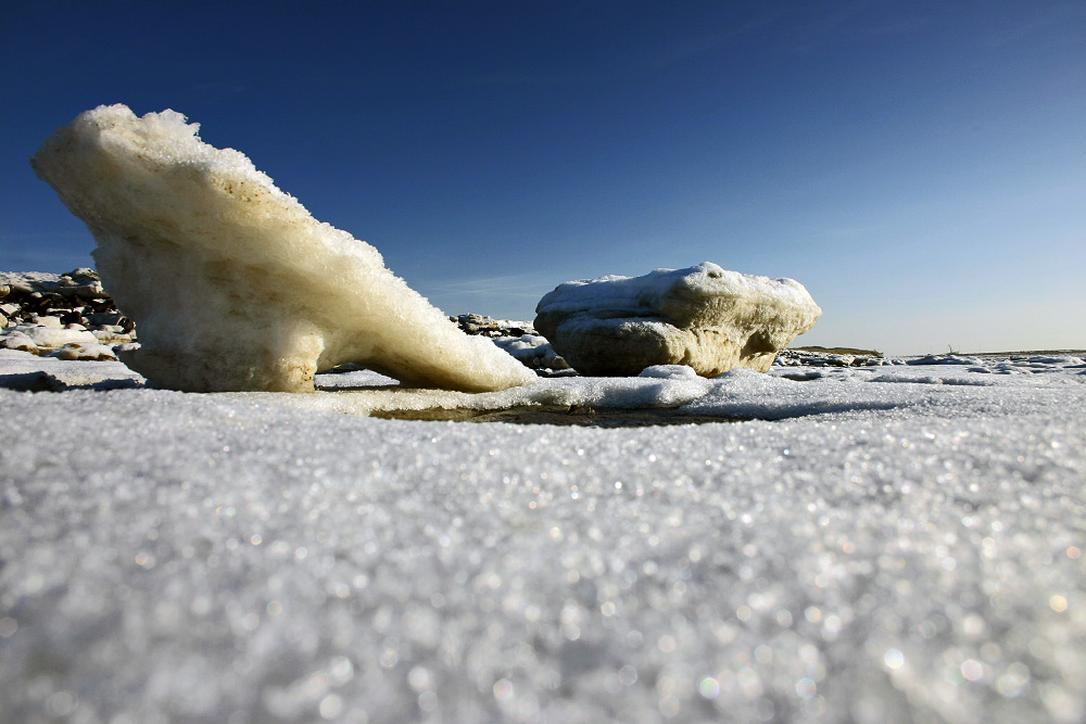 Ein paar kleine Eisschollen am Inselstrand.