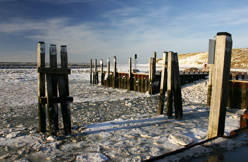 Anhand der Eisschollen im Hafenbecken kann man deutlich erkennen, daß erst kürzlich das Frachtschiff abgelegt haben muß.