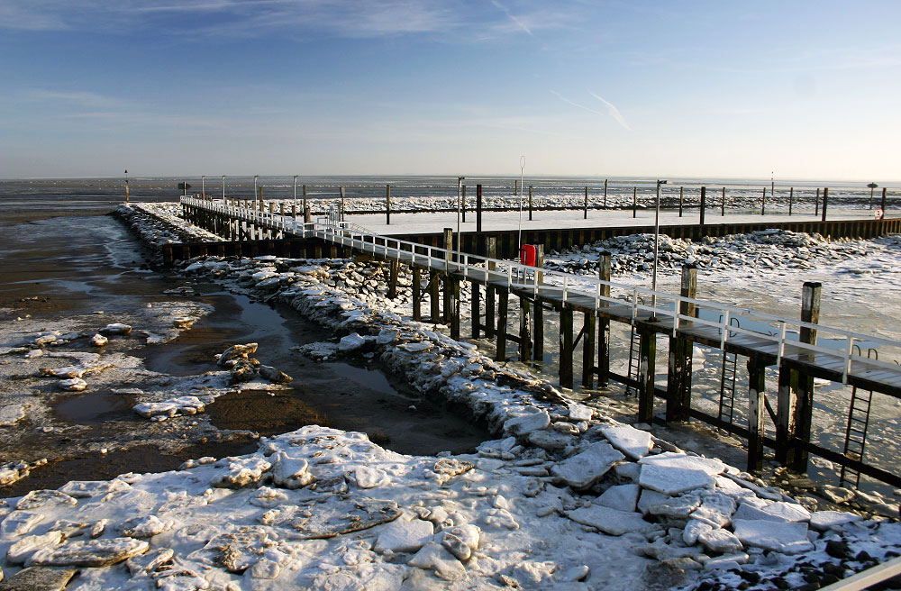Wir blicken hier von der Treppe der Schiffsmeldestelle hinab zum Yachthafen am Westanleger. Natürlich liegt in dieser Jahreszeit kein einziges Boot hier, dafür gibt es umso mehr Eis im Hafenbecken.