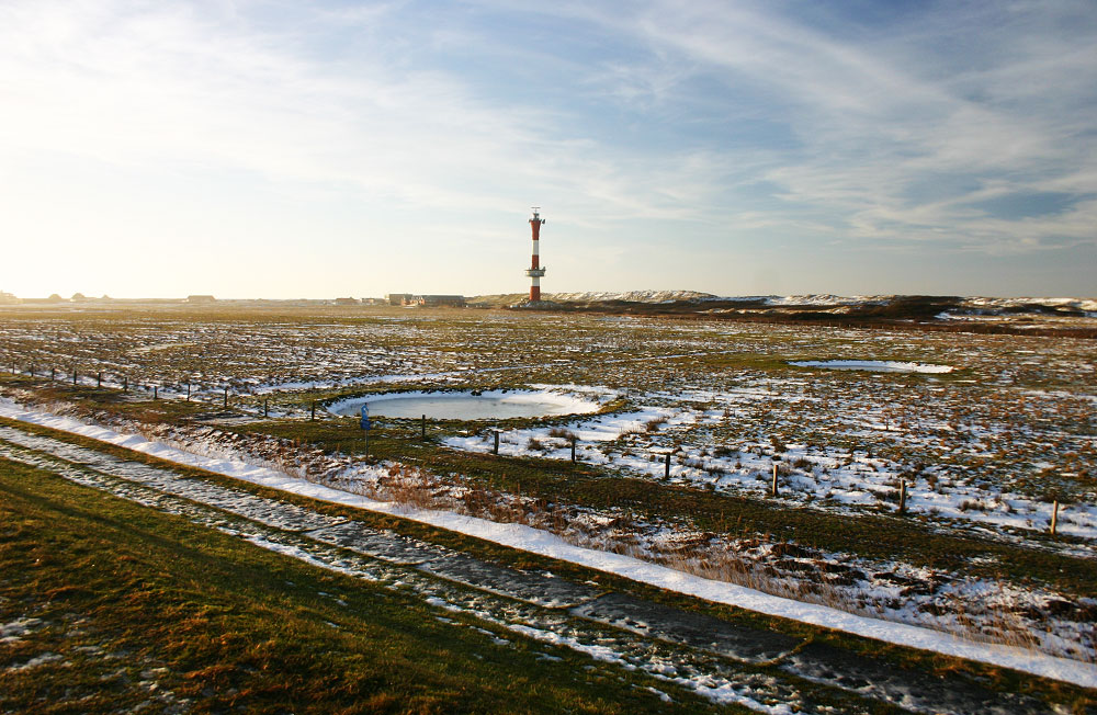 Ein Blick vom Deich auf den Westgroden. Im Hintergrund sehen Sie den Neuen Leuchtturm, ferner sind zwei Bombentrichter aus dem II. Weltkrieg zu erkennen, die sich über die Jahre und Jahrzehnte zu kleinen Biotopen entwickelt haben.