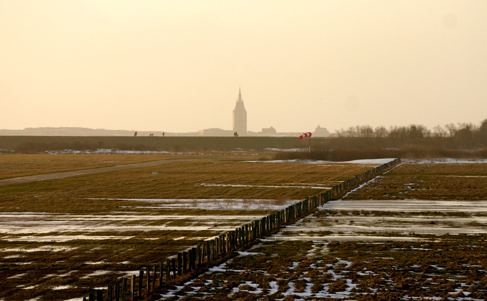 Ein Blick zum Ostgroden, in dem sich die Start- und Landebahn des Flugplatzes (links) wie auch eine Kuhweide (rechts) befinden. Damit keine Rinder auf die Landebahn laufen können, ist dazwischen ein Zaun gespannt.