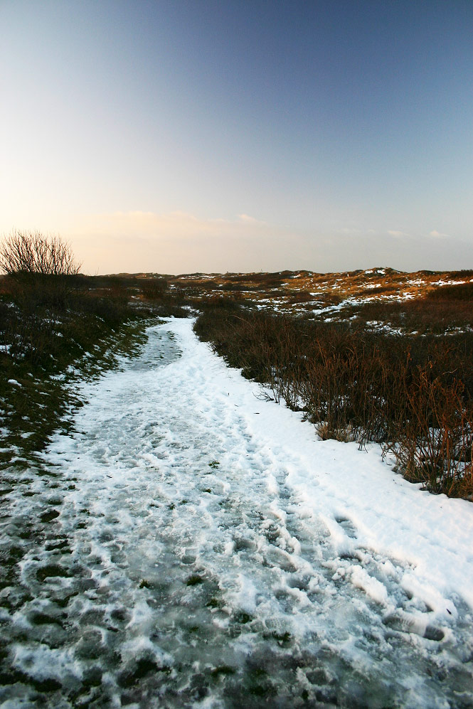 ‹ Zahlreiche Fußspuren zeugen davon, daß dies ein beliebter Fußweg durch die Ostdünen ist.Es wird langsam dunkel. Zeit, zum Dorf zurück zu kehren.