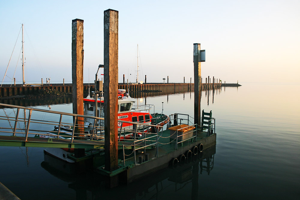 Das Seenotrettungsboot ›Wilma Sikorski‹ am Westanleger. Es herrscht beinahe Windstille, wie man an der spiegelglatten Wasseroberfläche erkennen kann.