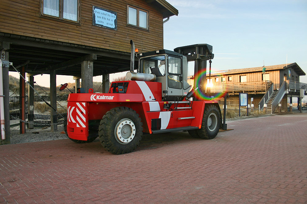 Mit diesem großen Gabelstapler von »Kalmar« werden Container vom Frachtschiff auf die Inselbahn geladen – und umgekehrt. »Wangerooge Cargo« nennt sich dieses Frachtsystem.