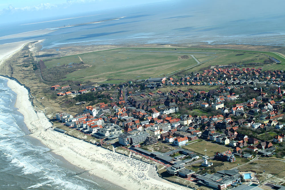 Große Teile des Inseldorfs sowie der Ostgroden sind auf dieser Aufnahme zu erkennen. Auf der rechten Seite ist gerade noch der Alte Leuchtturm sichtbar, oben links das »Osteert« und die Insel Minsener Oog.