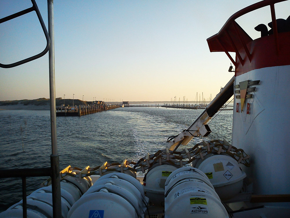 In aller Herrgottsfrühe ist die MS ›Harlingerland‹ an diesem Tag bereits das erste Mal zum Festland unterwegs. Hier ein Blick zurück zum Westanleger, den die Fähre vor wenigen Momenten verlassen hat.