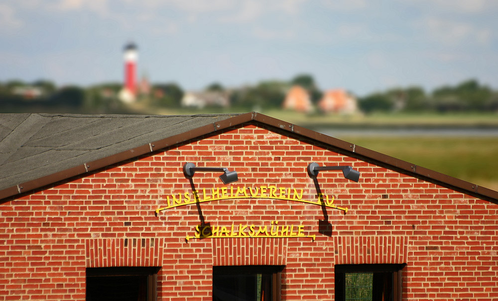 Die gelbe Schrift am Gebäude verrät es uns: Hier ist das »Inselheim Schalksmühle« zu sehen – und im Hintergrund befindet sich das Dorf mit Altem Leuchtturm.