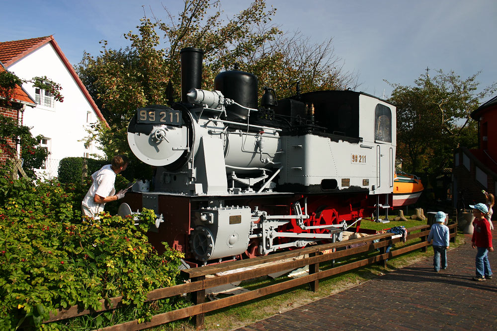 Nanu, ein frisches Mausgrau für die Museumslok vorm Alten Leuchtturm? – Nein, hierbei handelt es sich lediglich um den Voranstrich, hinterher wird die Dampflok natürlich wieder in gewohntem Schwarz erstrahlen (siehe oberer Bereich).
