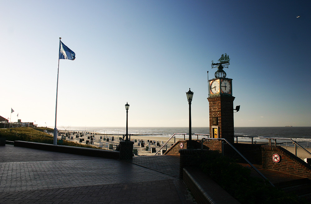 Genauso (menschen-)leer wie die Strandpromenade präsentiert sich der Himmel – zumindest, was die Wolken angeht. Lediglich ein Flugzeug ist unterwegs, wir sehen es rechts oben im Bild.