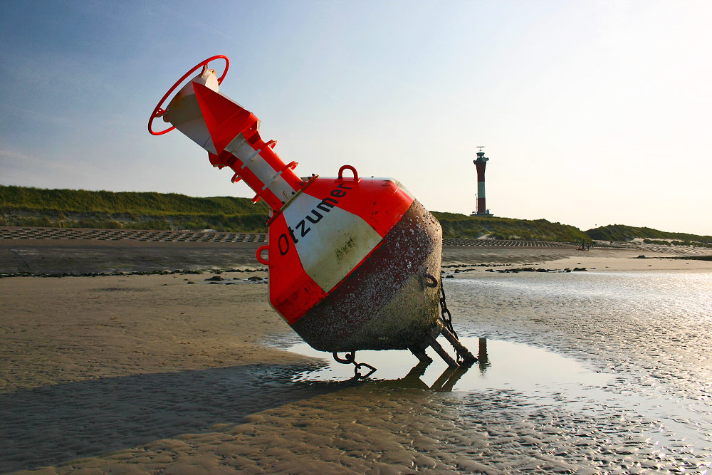 Bei einem Sommersturm hat sich die große Ansteuerungstonne der »Otzumer Balje« von ihrer ursprünglichen Position zwischen Spiekeroog und Langeoog losgerissen und ist auf Wangerooge gestrandet. An dieser Stelle lag sie zum Aufnahmezeitpunkt nun auch bereits einige Wochen.