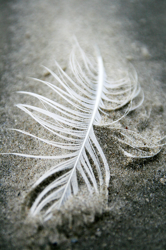 ‹ Eine zerzauste Möwenfeder im nassen Sand.