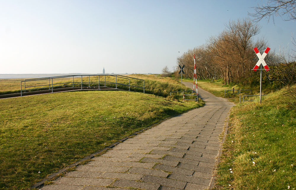 Geradeaus ist der Bahnübergang der Inselbahn-Stichstrecke zur Müllpreßstation zu sehen. Er ist sogar mit Schranken ausgestattet, diese werden allerdings nicht automatisch betrieben, daher fährt der Zug in den meisten Fällen langsam bei geöffneter Schranke durch.