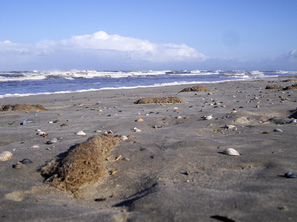Zahlreiche Muscheln und anderes Strandgut wurden von den Wellen an den Strand geworfen. Im Hintergrund brandet die Nordsee.