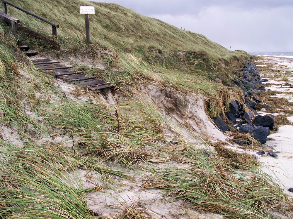 Der Fuß der Dünen wird durch schwere Steine verstärkt, ohne die die Dünen wahrscheinlich noch mehr in Mitleidenschaft gezogen worden wären.