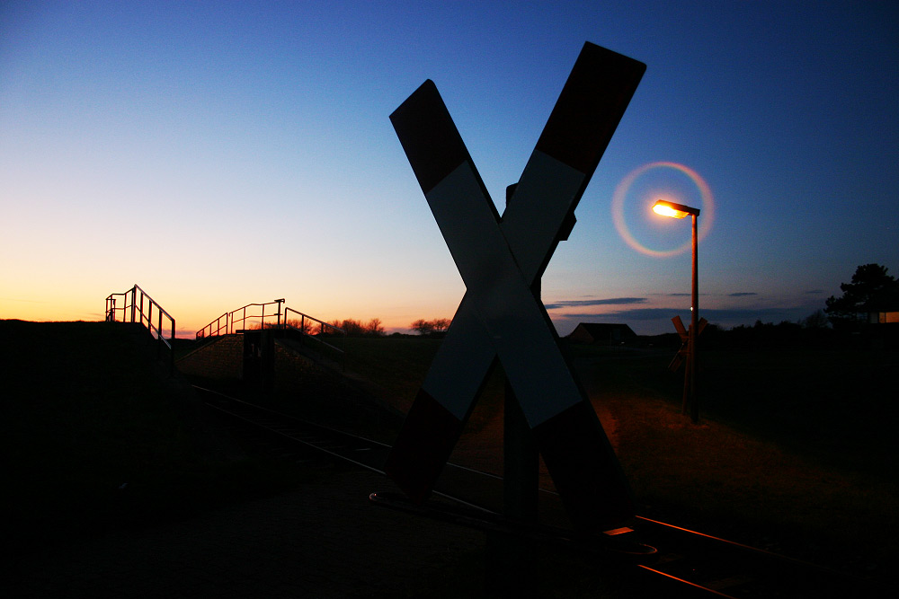 Der Bahnübergang am Deichschart wird durch zwei Andreaskreuze markiert. Heute wird hier allerdings kein Zug mehr entlang fahren, morgen erst wieder.