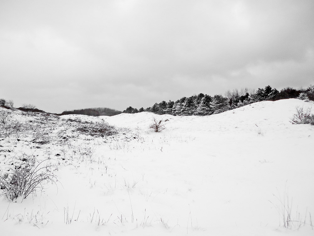 Das Dünengras und das Heidekraut liegen unter einer dichten, schützenden Schneedecke begraben. Im Hintergrund sind die Bäume des »Schulwäldchens« zu erkennen.