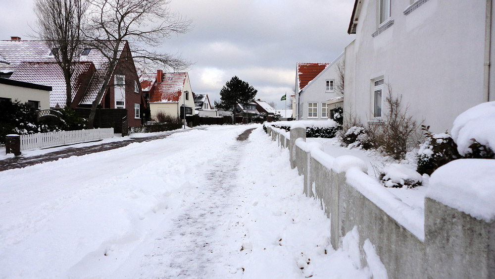 Das Dorf ist tief verschneit: Auch die »Kapitän-Wittenberg-Straße« macht einen hoch winterlichen Eindruck auf uns.
