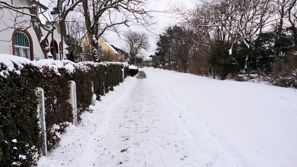 Die »Bahnhofstraße« im Winter. Zur Linken sehen Sie das »Haus Helena« und das »Gästehaus Nordsee«, zur Rechten den verwilderten »Niobeplatz«.