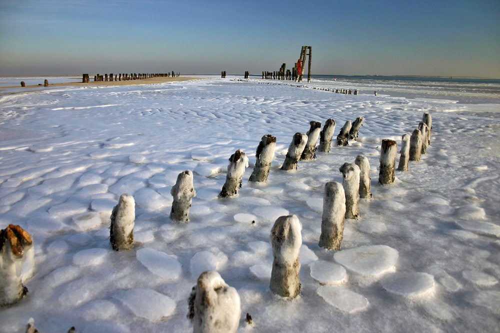 Herrliche Winterstimmung am Wangerooger Ostende. Die Pfähle im Hintergrund markieren die ehemaligen Anlegestellen des Ostanlegers.