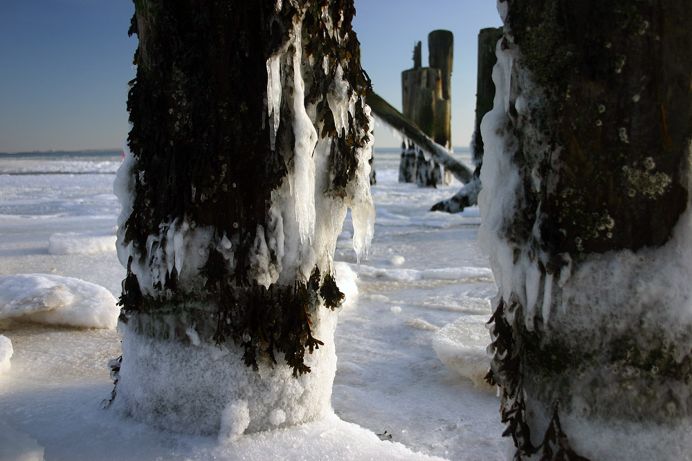 Die alten Dalben des »Lloyd-Anlegers« sind mit Eiszapfen behangen und machen einen eisig-kalten Eindruck auf den Betrachter.