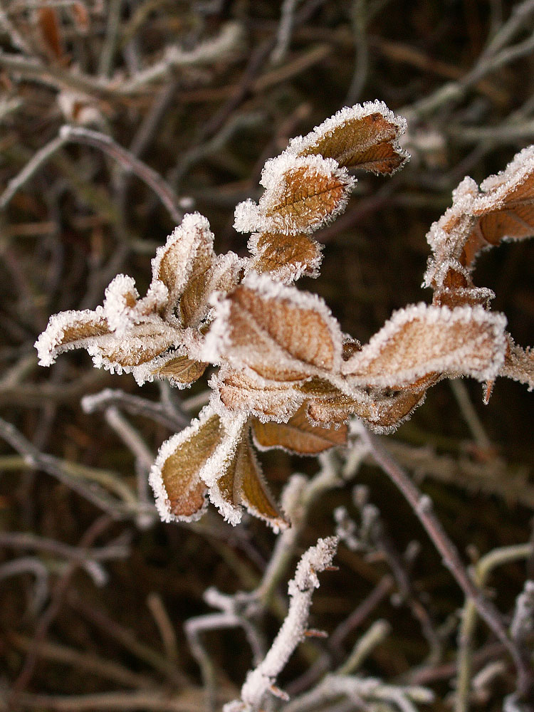 ‹ Die trockenen Blätter der Kartoffelrose sind mit Reif besetzt, der sich dort bei gefrierendem Nebel abgesetzt hat.