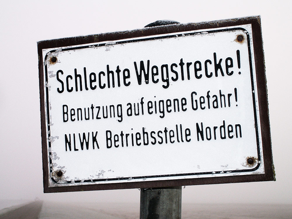 Der »Niedersächsische Landesbetrieb für Wasserwirtschaft, Küsten- und Naturschutz« hat am Deich Hinweisschilder aufgestellt, die auf eine schlechte Wegstrecke hinweisen. Doch keine Sorge, so schlecht ist der Weg nun auch nicht, sowohl per Fahrrad als auch zu Fuß kann man alle Wege prima benutzen.