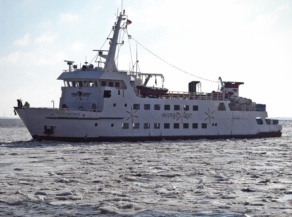 Das Motorschiff ›Harlingerland‹ kämpft sich durch die Eisschollen am Westanleger hindurch. Zwar ohne Fahrgäste, doch dafür mit umso mehr Versorgungsgütern (die blauen Container im Heckbereich) sowie der Post (gelbe Container, leider verdeckt).