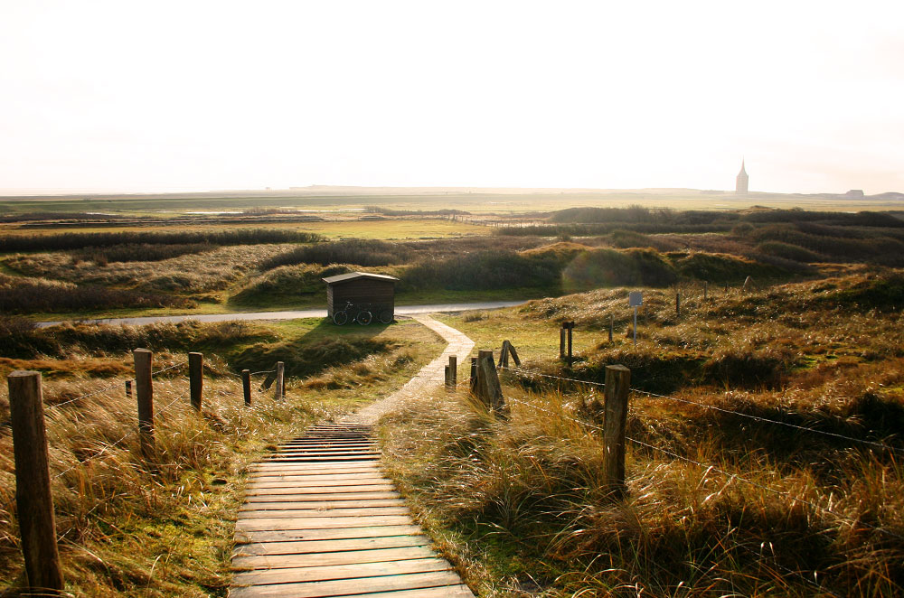 Von der Dünenüberwegung aus schauen wir hinab auf den Westinnengroden mit »Straße zum Westen«, »Grimmshörn« und dem ehemaligen »Reichsdeich«.
