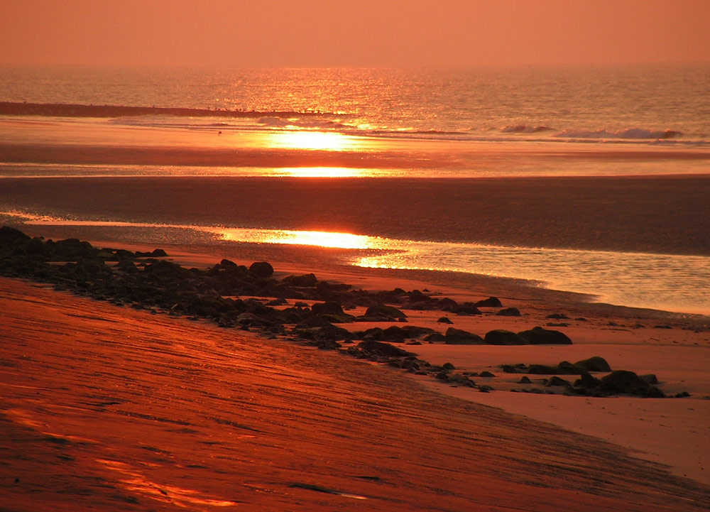 Die tiefstehende Sonne spiegelt sich in den Prielen und im Meer. Im Vordergrund der untere Bereich des Nordwest-Längswerks.