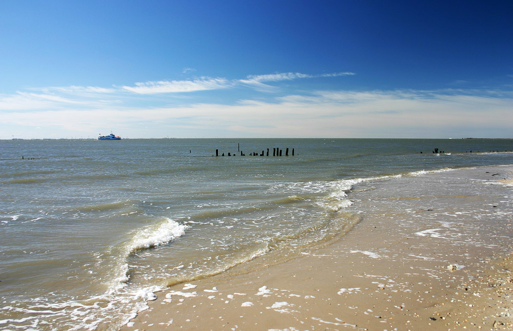 Sanft brandet die See an den Oststrand. Die Pfähle, die aus dem Wasser schauen, gehören zum ehemaligen »Lloydanleger« im Osten.