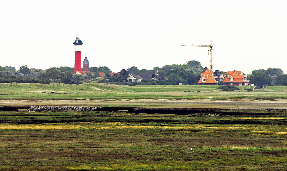 Ein Blick quer über die Lagune und die Salinebucht hin zum Dorf mit dem Alten Leuchtturm und der evangelischen Kirche.