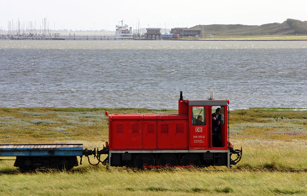 Ein genauerer Blick zur Lok »399 105-6«, die 1990 in Rumänien bei FAUR gebaut und an das »VEB Mansfeld-Kombinat Wilhelm Pieck« ausgeliefert wurde. Anfang der 1990er Jahre kam die Lok dann bereits zur Insel, wo sie seitdem ihren Dienst tut. Oft ist die Lok vor Güterzüge gespannt, doch ab und an zieht sie auch Personenzüge, so wie in diesem Fall.