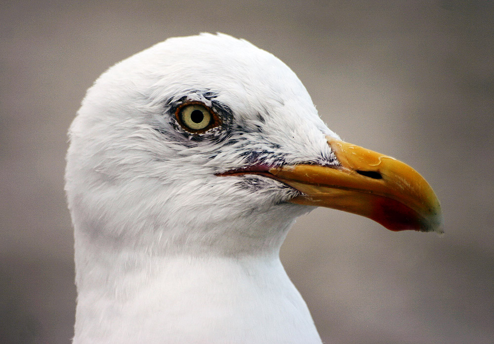 Der durchdringende Blick einer Silbermöwe durchs Teleobjektiv betrachtet. Der rote Fleck vorne am Schnabel nennt sich übrigens »Gonysfleck« – Jungtiere betteln diesen Fleck an und können durch ihn die Futterquelle identifizieren.
