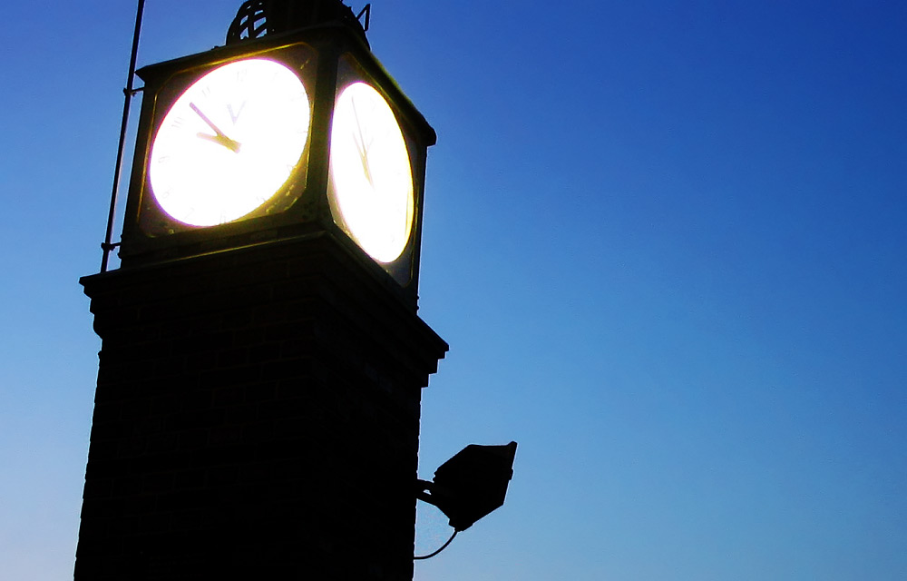 Die Uhr an der Strandpromenade, unterhalb des Puddings, in der Abenddämmerung.