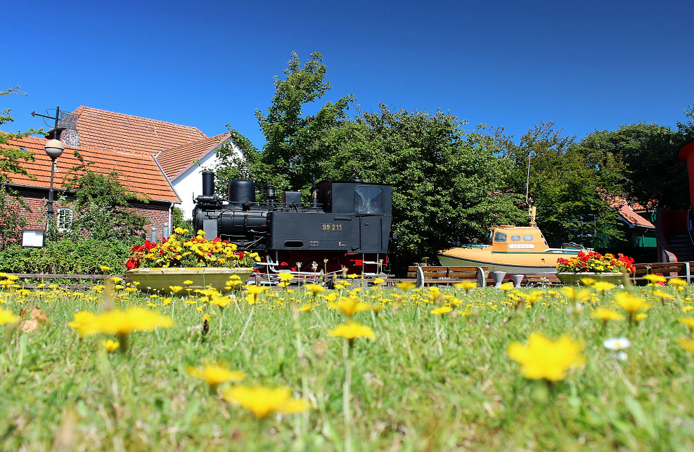Das Wangerooger Heimatmuseum erstreckt sich nicht nur auf den Bereich innerhalb des Leuchtturms, auch davor gibt es zahlreiche Exponate zu bestaunen, beispielsweise (von links nach rechts) die Helmstange des ehemaligen Westturms, die alte Dampflok »99 211« und das Seenotrettungsboot »Gesina«.